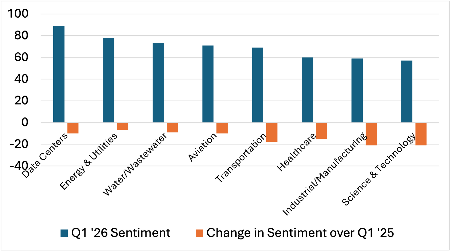In terms of specific markets, sentiment ratings reflect that a major driver of recent and anticipated growth has been the activities of the artificial intelligence hyper-scalers (AWS, Google, Microsoft, Meta, etc.) and the direct and indirect demand for architecture, engineering and environmental services they are creating. Data center construction obviously involves sophisticated MEP engineering services among other disciplines, but it also creates demand for energy production & distribution, water supply, wastewater management and related environmental compliance services.